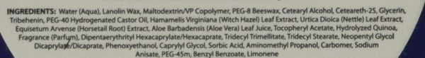 Water, Lanolin Wax, Maltodextrin/VP Copolymer, PEG-8 Beeswax, Cetearyl Alcohol, Ceteareth-25, Glycerin, Tribehenin, PEG-40 Hydrogenated Castor Oil, Hamamelis Virginiana (Witch Hazel) Leaf Extract, Urtica Diocia (Nettle) Extract, Equisetum Arvense Extract, Aloe Barbadensis (Aloe Vera) Leaf Juice, Tocopheryl Acetate, Hydrolyzed Quiona, Fragrance, Dipentaerythrityl Hexacaprylate/Hexacaprate, Tridectyl Trimellitate, Tridecyl Stearate, Neopentyl Glycol Dicaprylate/Dicaprate, Phenoxyethanol, Caprylyl Glycol, Sorbic Acid, Aminomethyl Propanol, Carbomer, Sodium Anisate, PEG-45m, Benzyl Benzoate, Limonene.